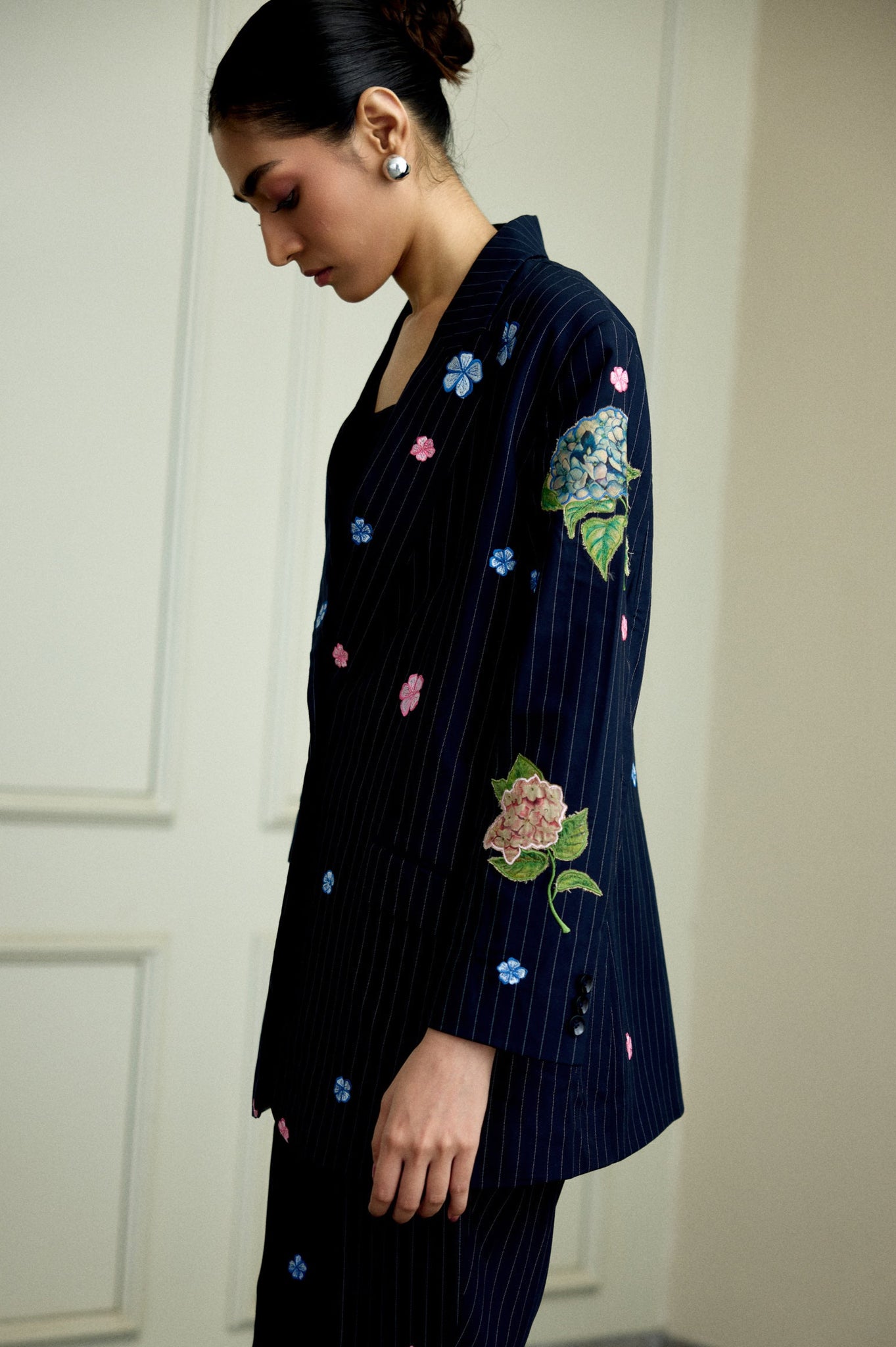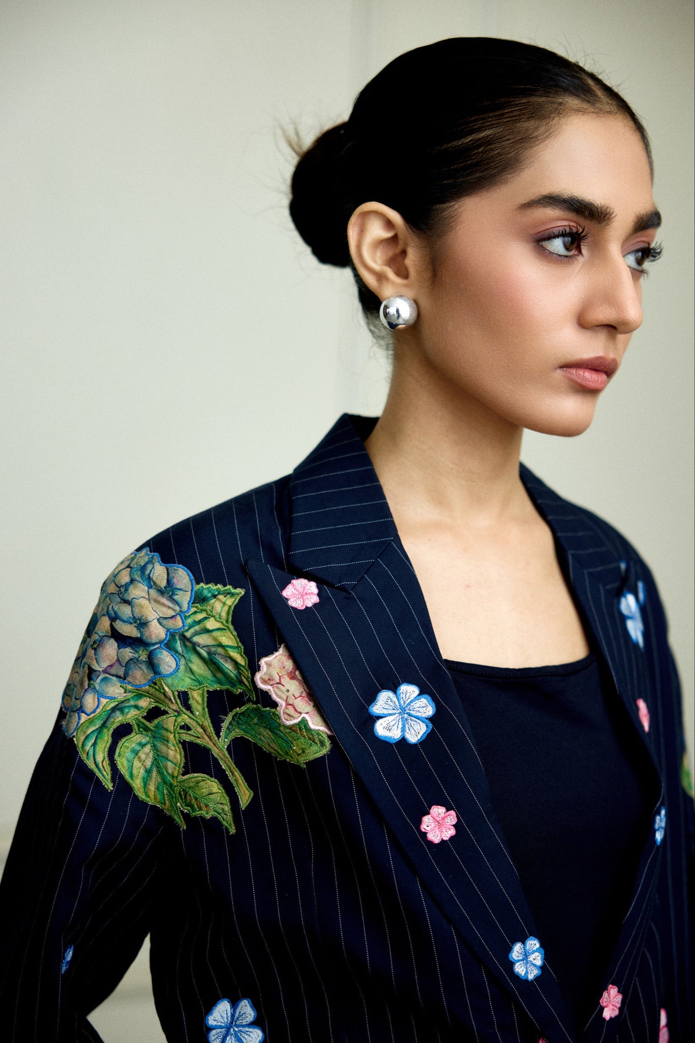 The Arden Blazer is tailored from luxurious Italian suiting fabric in a sophisticated navy blue, enhanced by delicate hand-painted floral accents. This piece melds classic craftsmanship with artistic flair, offering a refined way to stand out with elegance.