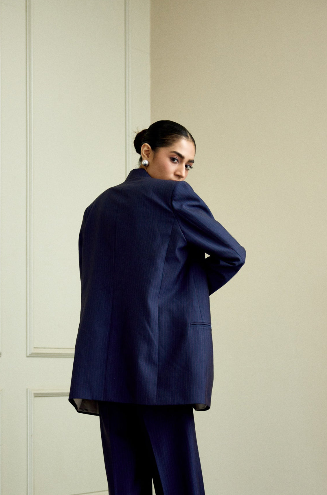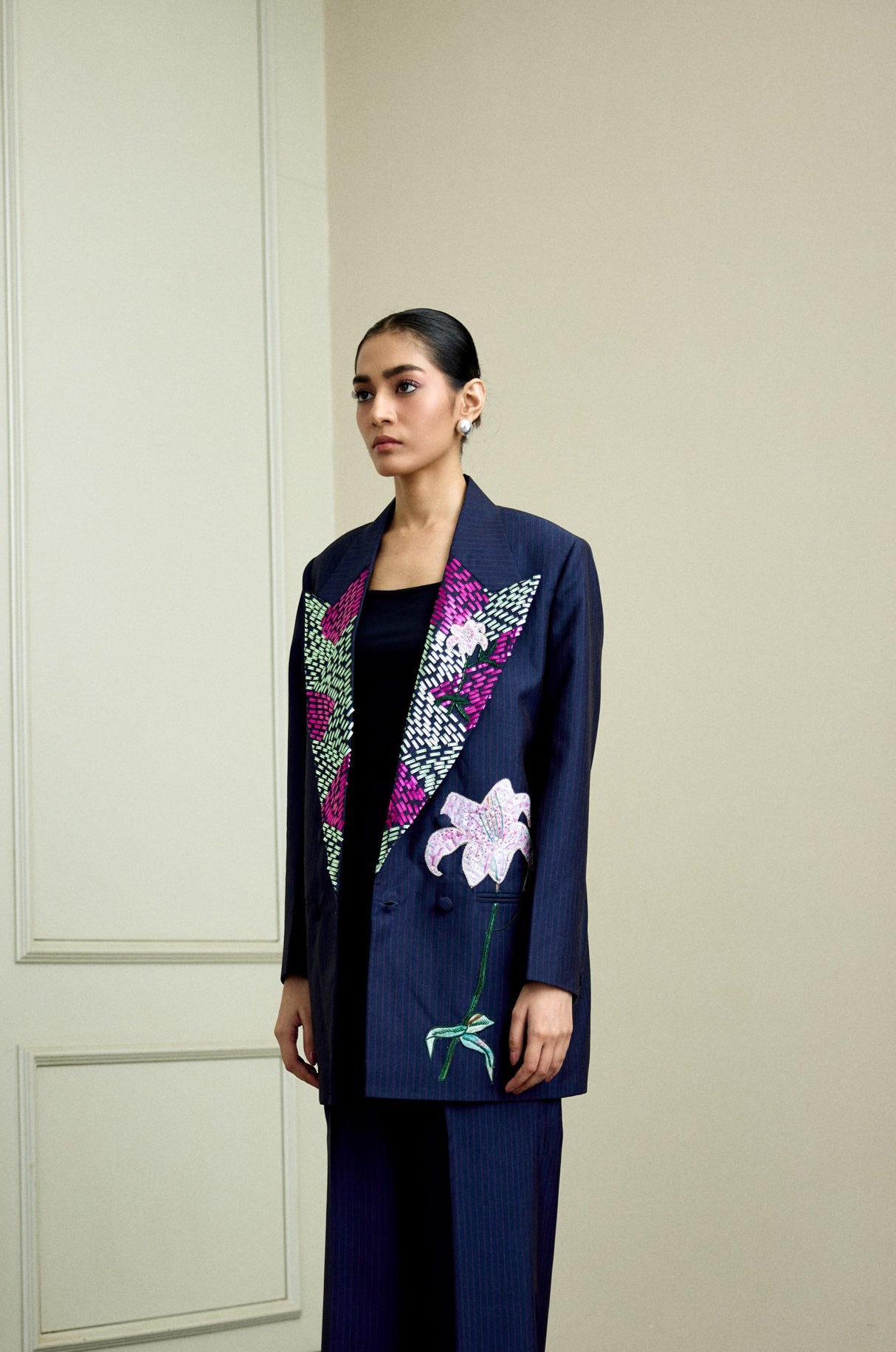 Enhance your wardrobe with the Clio Blazer, made from exquisite navy blue Italian suiting fabric. Adorned with a hand-painted lily and subtle hand-embroidered accents, this blazer combines artistic detail with classic sophistication. Ideal as elegant outerwear, it provides both comfort and a polished, confident appearance.