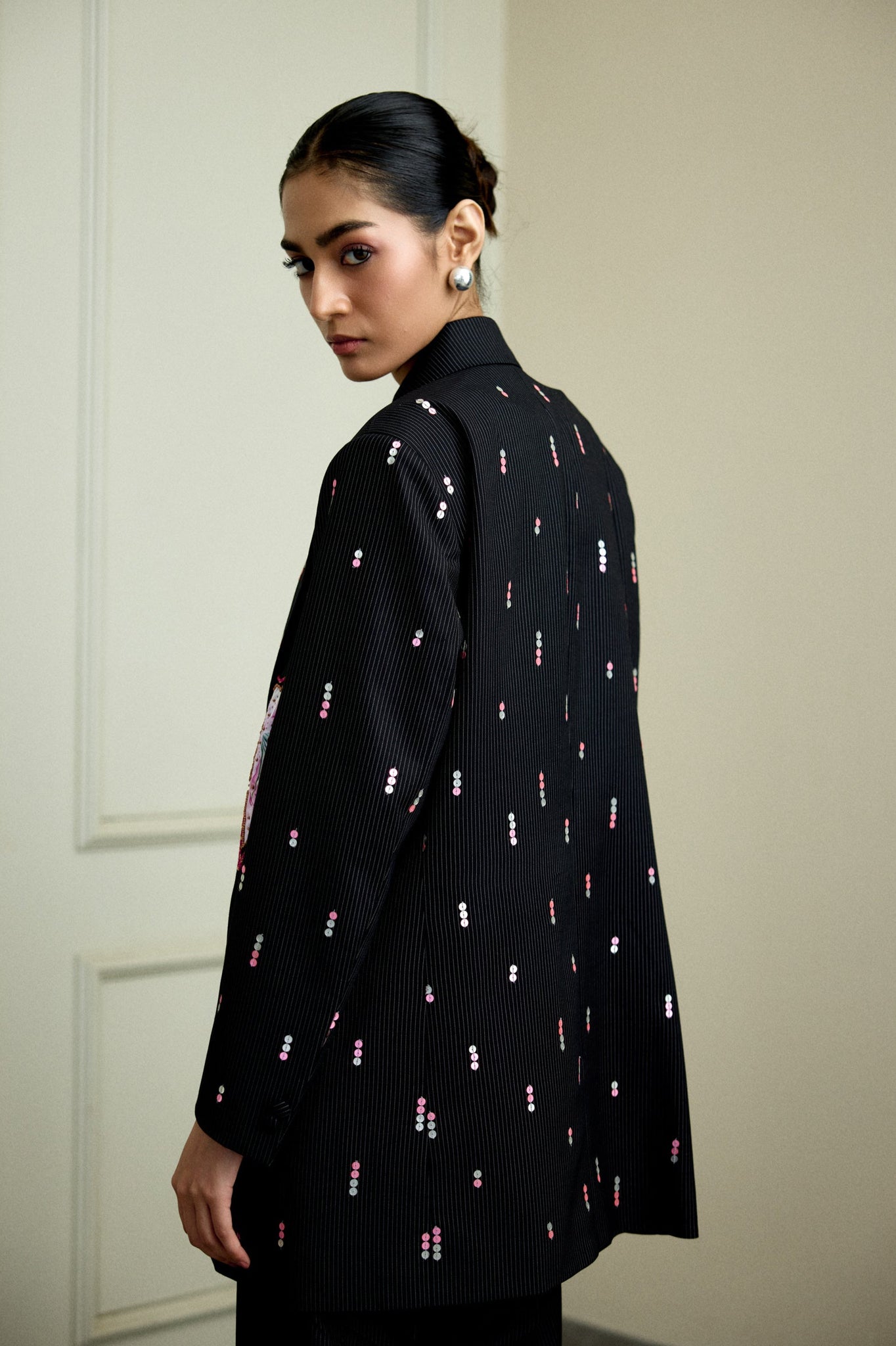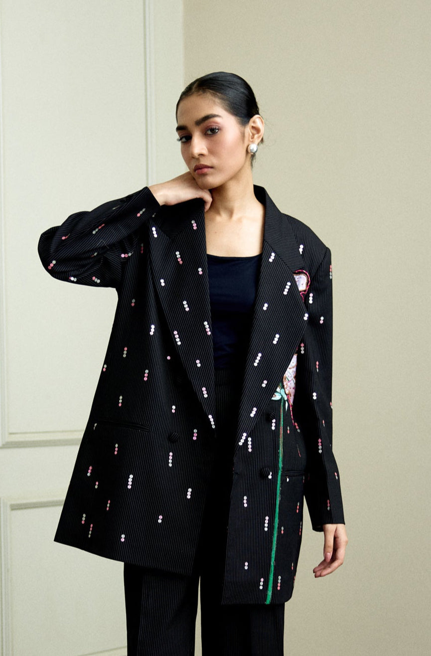 Elevate your closet with the Eris Blazer, featuring a black jacket adorned with intricate pink floral embroidery. Made from premium Italian suiting fabric, this elegant garment blends timeless sophistication with a hint of color. The exquisite embroidery adds depth and texture, while the tailored cut enhances your figure for a sleek and polished look. Ideal for events where refined and distinctive style is essential.