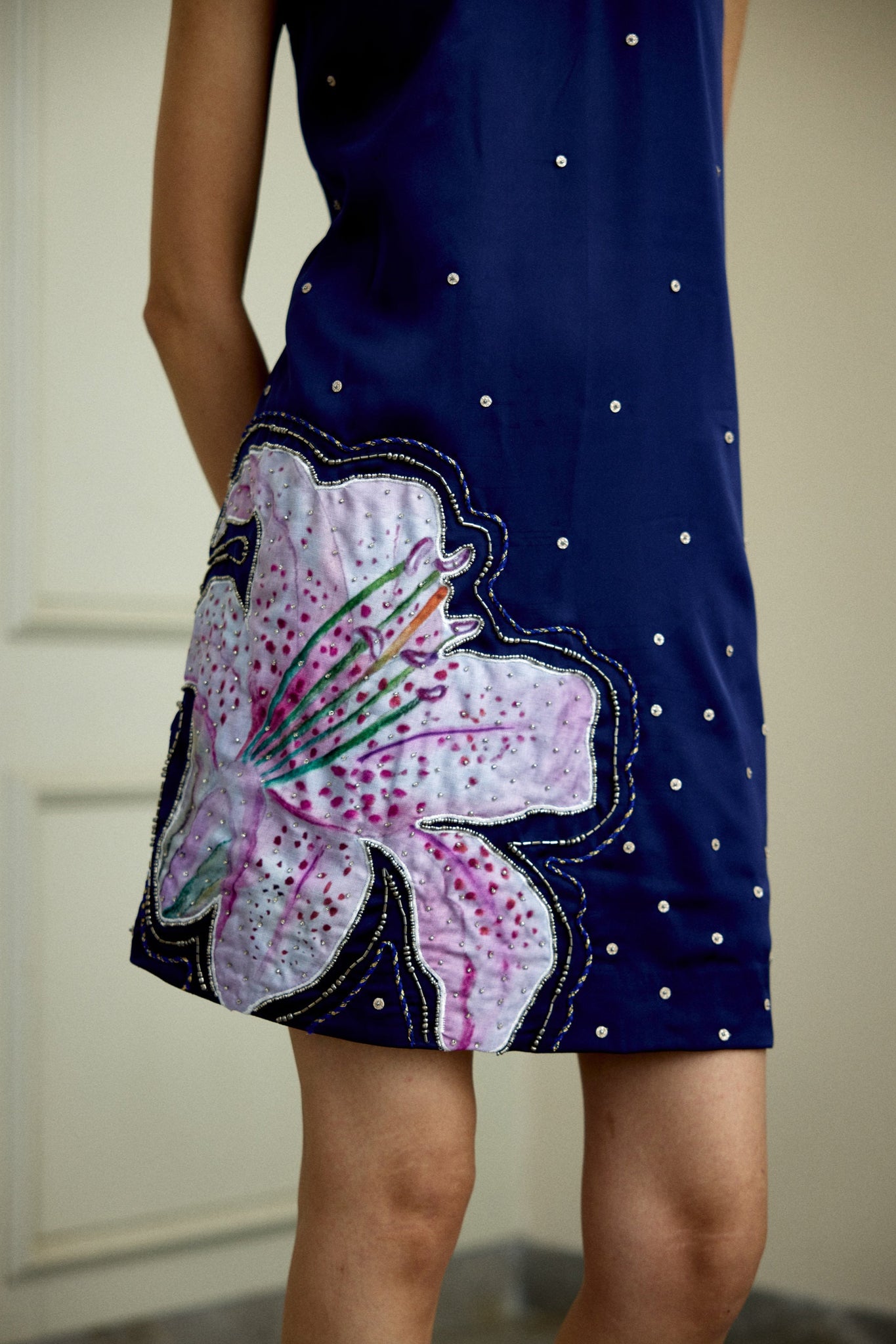 The Ophelia Shift Dress offers a refined silhouette in dark blue, adorned with delicate floral patterns that evoke timeless elegance. Sleeveless and crafted with hand-embroidered details, this short dress combines artisanal craftsmanship with a sleek design, making it an ideal choice for sophisticated occasions.