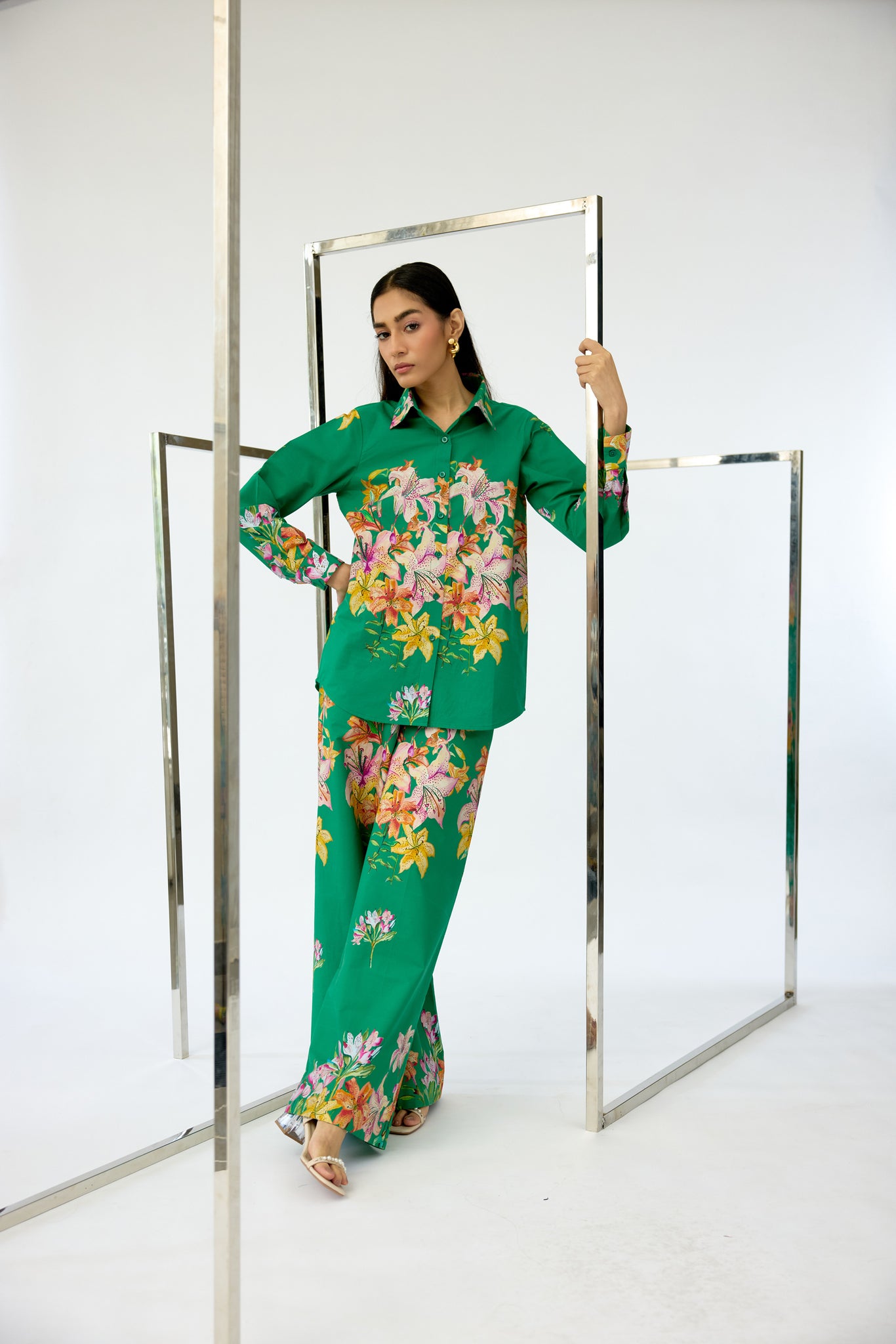 The Azalia Co-ord in a rich green hue features a delicate floral pattern on premium poplin fabric, blending luxury with comfort. This sophisticated co-ordinate set is ideal for party wear and as stylish outwear, ensuring you make a graceful impression at every occasion.