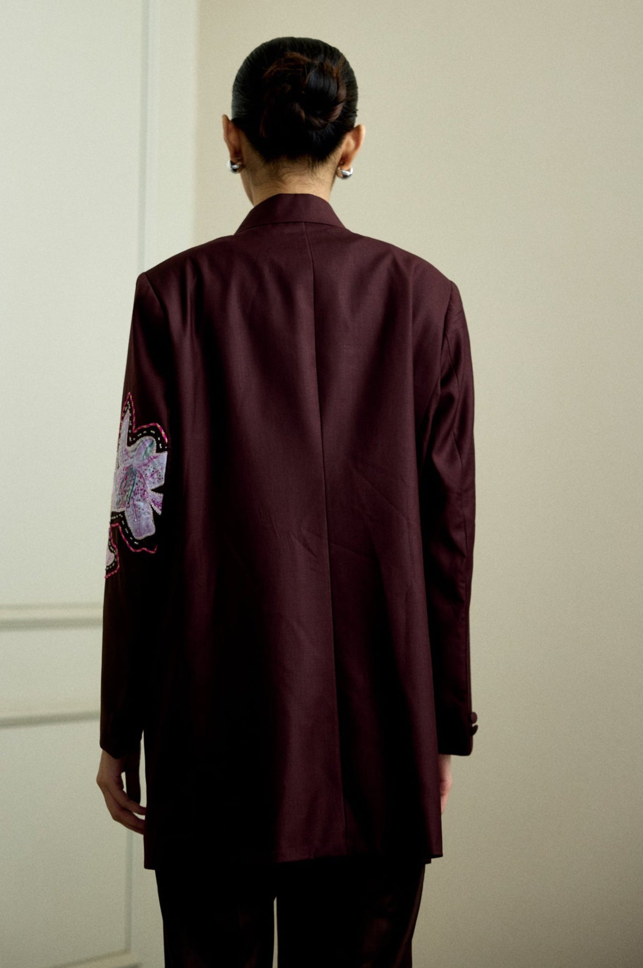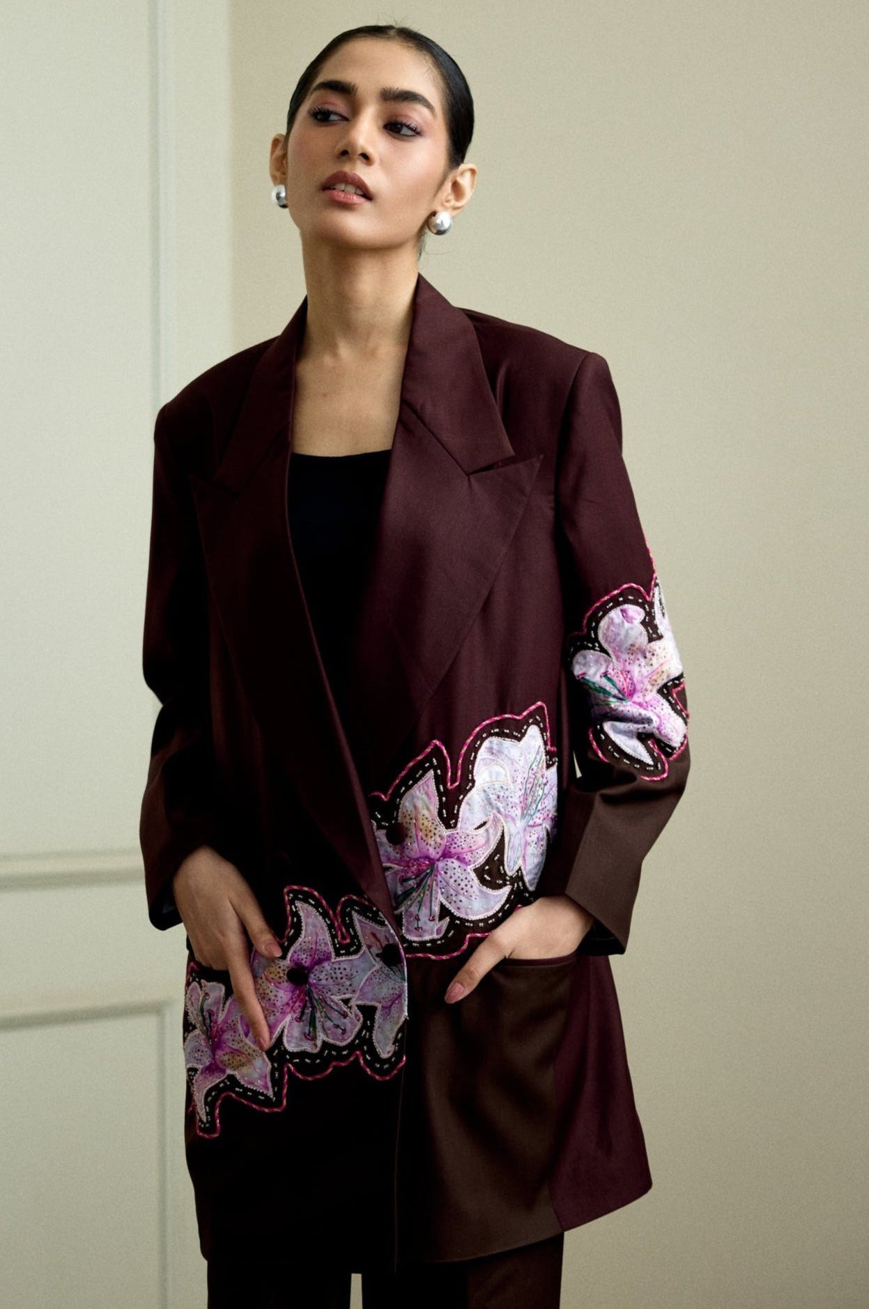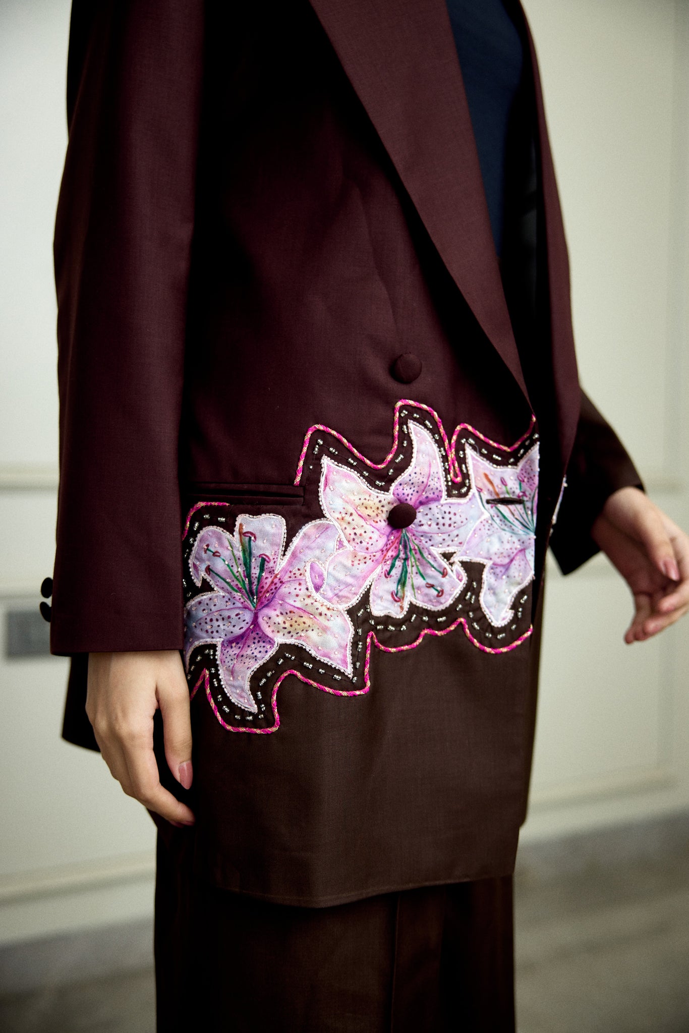 Elevate your wardrobe with the Orya Blazer Set, featuring a rich brown blazer adorned with exquisite floral Lily hand embroidery and delicate painted details. This sophisticated ensemble combines timeless elegance with artisanal craftsmanship, perfect for making a confident statement at any occasion.